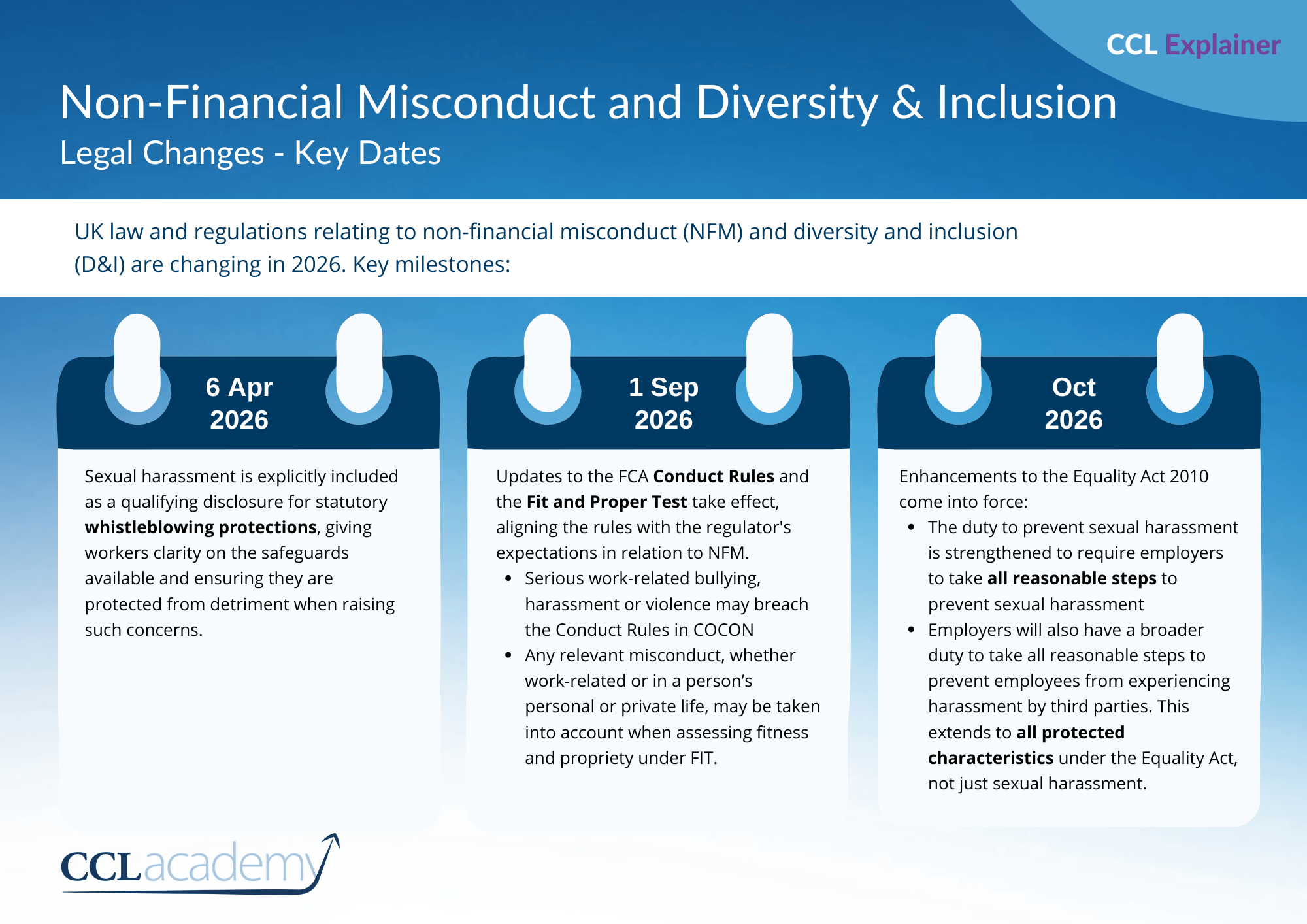 2026 brings important changes to UK law and regulation on non-financial misconduct (NFM) and diversity & inclusion (D&I). Updated FCA rules clarify the regulator's expectations around NFM, both in the workplace and beyond, while changes to the Equality Act strengthen the obligations on employers to prevent harassment.
